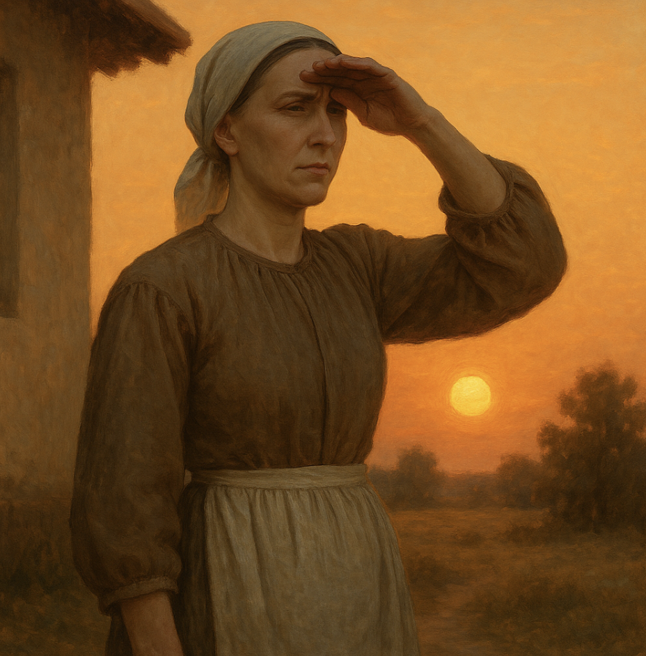 - Жест долонею — у тексті вона «прикрила очі долонею», тому цей жест став центральним у композиції, щоб підкреслити момент її погляду вдалечінь.