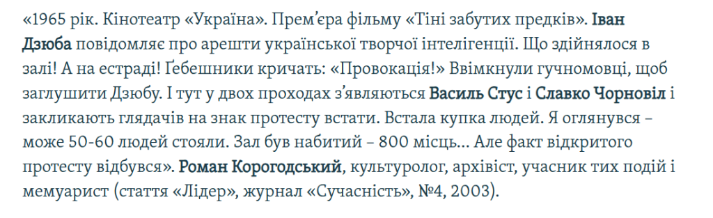 - Публічний протест у кінотеатрі «Україна» в Києві під час показу фільму Сергія Параджанова «Тіні забутих предків» (В.Стус, В.Чорновіл, І.Дзюба)
