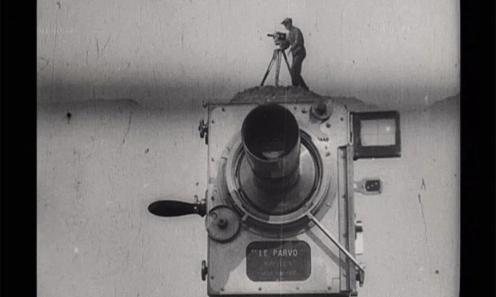 Кінооператор Михайло Кауфман стоїть на кінокамері “Le Parvo”. Комбінований кадр із фільму «Людина з кіноапаратом».