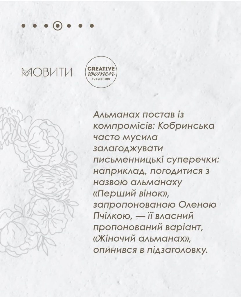 «Я була тією людиною, яка спершу думала про коментоване академічне видання з текстами літературознавців — але зрештою ми зійшлися на такому компромісному варіанті: надати історії 17 авторок “Першого вінка” та його видавничих залаштунків окремою книжкою, написаною фаховими літературознавицями, але в максимально доступній формі», — повідомила видавчиня.