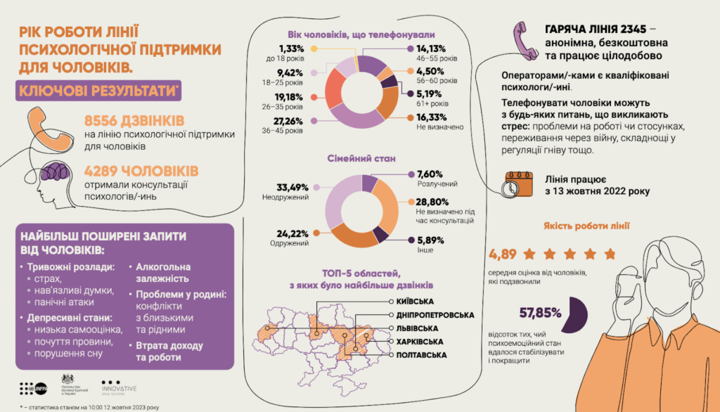 У жовтні 2022 року в Україні запрацювала безкоштовна цілодобова гаряча лінія психологічної підтримки для чоловіків за коротким номером 2345.За рік її роботи психологи служби надали 4289 консультацій чоловікам.