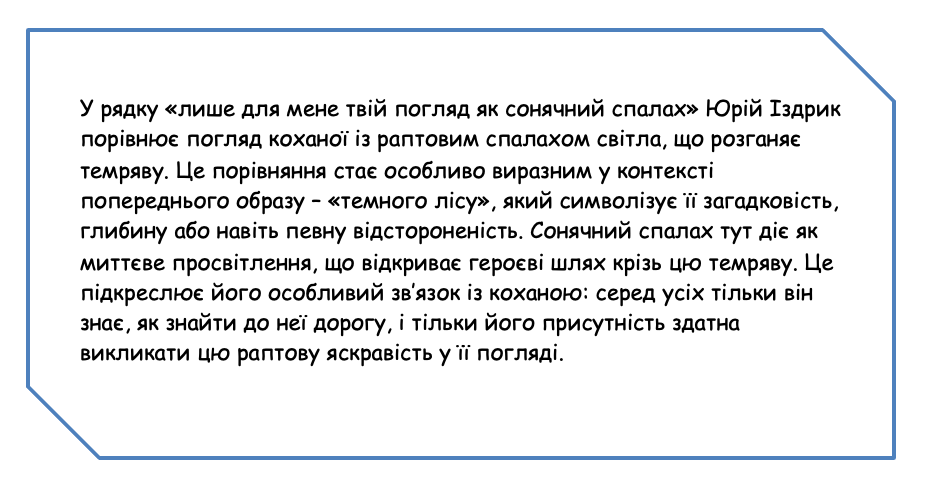 Приклад учнівської відповіді (стосовно іншого вірша Ю. Іздрика, у якому є рядки: «тільки я знаю стежку крізь темний твій ліс / лиш для мене твій погляд як сонячний спалах») наведено нижче.