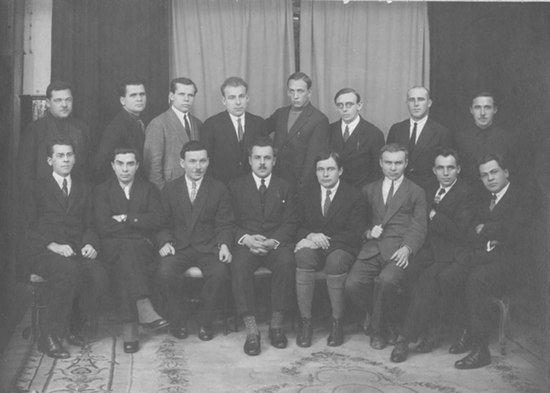 Стоять, зліва направо: Михайло Майський, Григорій Епік, Олександр Копиленко, Іван Сенченко, Павло Іванов, Юрій Смолич, Олесь Досвітній, Іван Дніпровський.