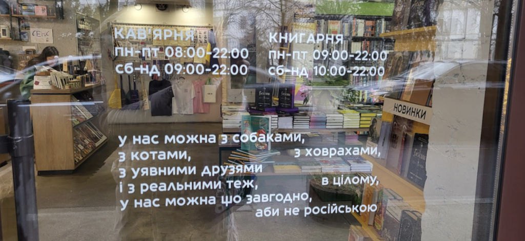 Відповідь: заклад популяризує та пропагує українську мову та культуру. Тут немає місця жодному російськомовному виданню чи події; увага до дітей, що втілюється завдяки наявності різноманітної дитячої літератури та облаштованому дитячому простору. Такий підхід не лише популяризує дитяче читання, а й дає батькам час спокійно обрати і собі книгу для читання; турбота про міський простір завдяки книгам із урбаністики.
