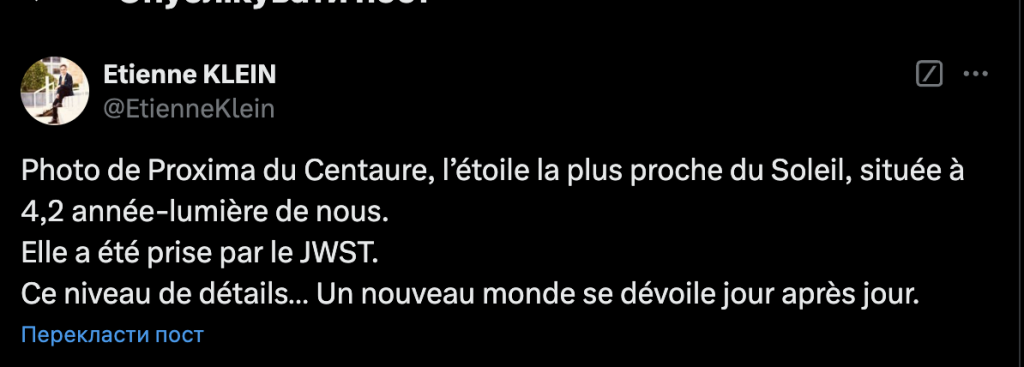 Це, як заявив видатний французький вчений Етьєн Кляйн, останній дивовижний знімок Проксими Центавра, найближчої до нашого Сонця зірки, зроблений космічним телескопом Джеймса Вебба.
