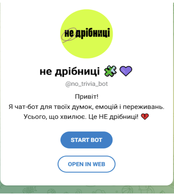1. Зайдіть на сайт https://www.notrivia.com.ua/#bot та запустить чат бот “не дрібниці” https://t.me/no_trivia_bot