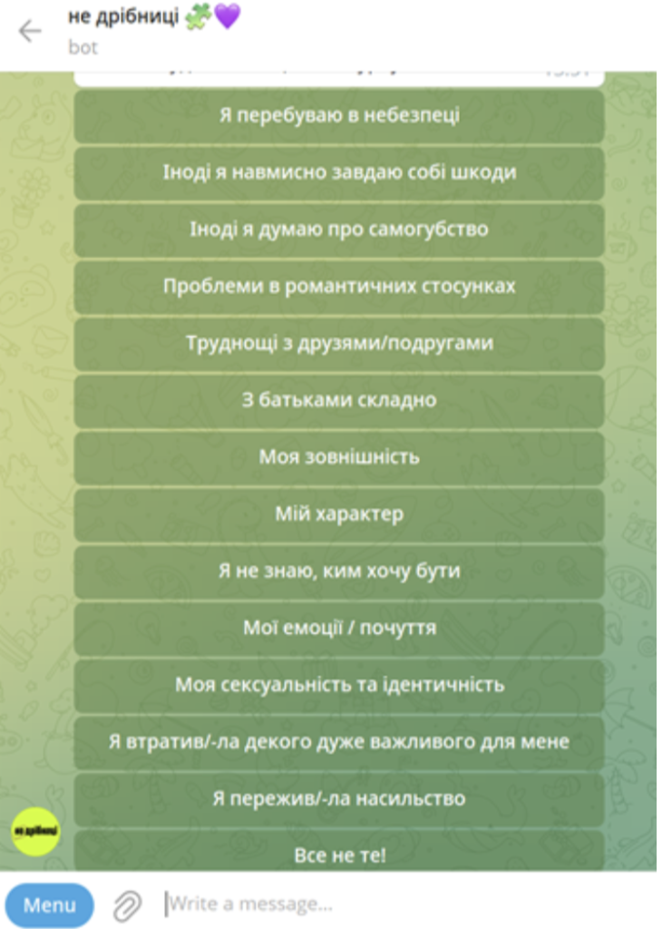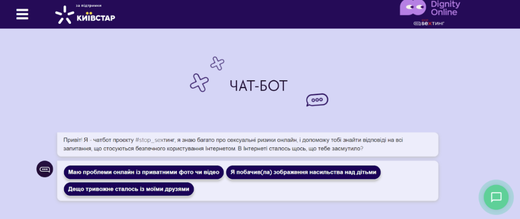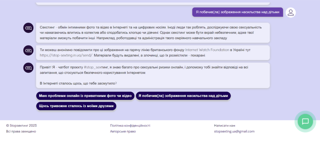 2. Проаналізуй чат-бот громадської організації  #stop_sexтинг. Визнач ключові повідомлення до кожного блоку запитань.
