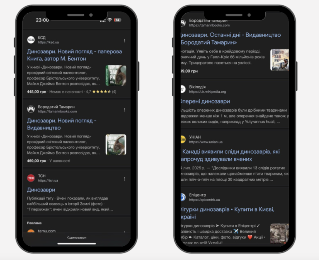 Розгляньте стрічку пошуку на двох телефонах. Це результати запиту “динозаври”. Порівняйте їх. Як думаєте, чим викликані відмінності?
