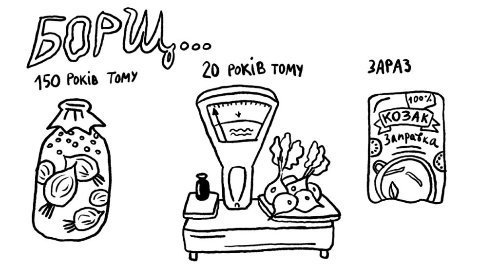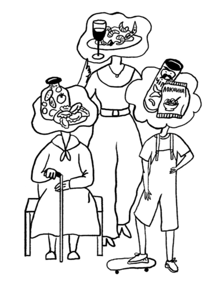 На ілюстрації зображено три покоління однієї родини: бабусю (на що вказує хустина на плечах), маму (на що вказують підбори та прикраса на шиї) та дитина-підліток (на що вказує зріст та захоплення активним видом спорту). Вірогідно, бульбашка на місці голови — це думки, бажання чи вибори цієї особи. Бабуся обирає традиційну їжу — консервовані овочі, приготування яких вимагає багато зусиль, та традиційну українську страву — вареники, мама обирає екзотичні морепродукти та келих напою, дитина обирає страви швидкого приготування та снеки. Тобто всі троє персонажів ілюстрації обирають ту їжу, яка для них є звичною чи пріоритетною, яка в цей момент є для них комфортною і улюбленою, їхні вибори відрізняються, і на це впливають традиції, вік, можливості (бабусі не доступні морепродукти, дитина не обирає страву, яку потрібно готувати довго).