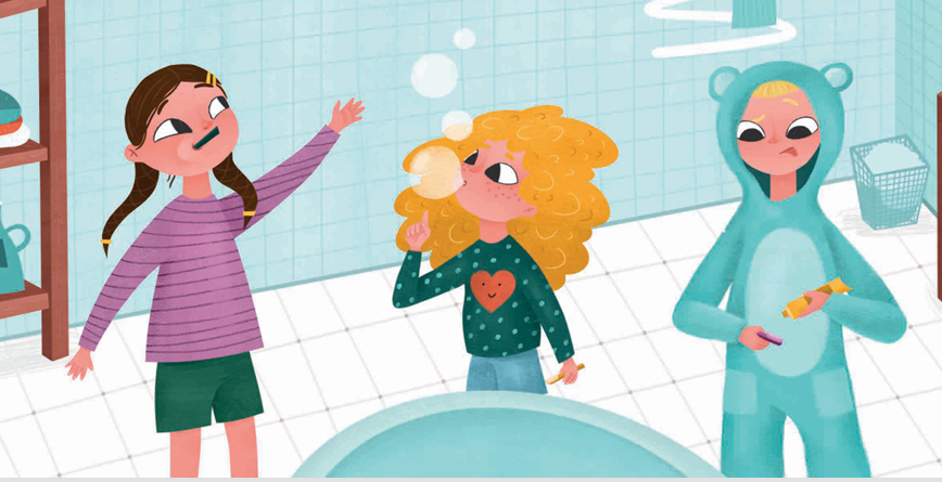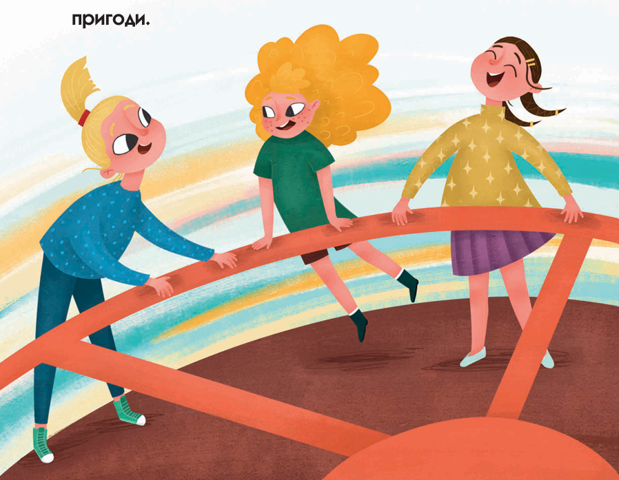 У назві книжки “Про трьох відважних лицарів” слово “лицарі” вжито в чоловічому роді множини, тоді як на ілюстраціях ми скрізь бачимо трьох подружок, які граються в лицарок. Їхня уява малює їм пригоди в цілком буденних ситуаціях: на майданчику, за обідом, під час підготовки до сну. Скажімо, у тексті “відважні лицарі” рятують прекрасну принцесу від злого дракона, а на малюнку ми бачимо, як тато годує малюка броколі, той плюється і верещить.