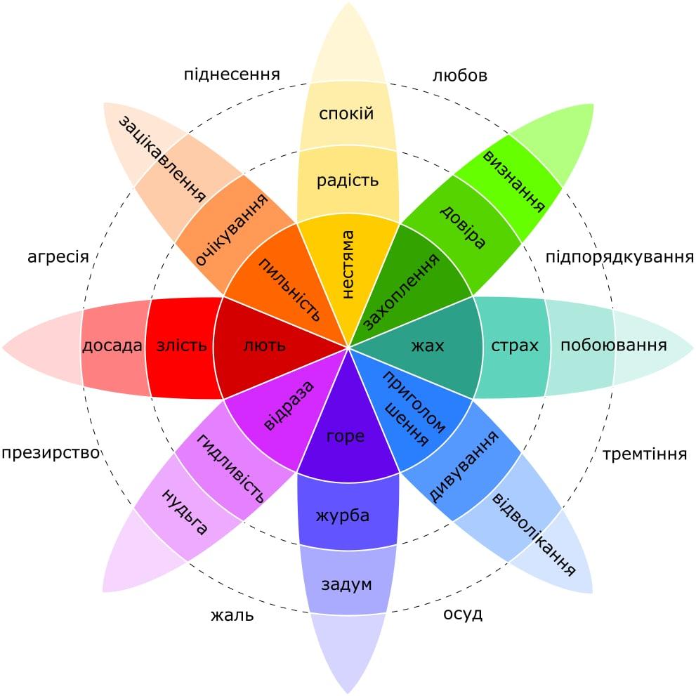 Це “колесо емоцій” Роберта Плутчика (Robert Plutchik) — модель, яка ілюструє, як емоції пов’язані між собою, комбінуються та трансформуються. Модель схожа на квітку або колесо: в центрі — базові емоції, далі — їх слабші або сильніші варіанти.