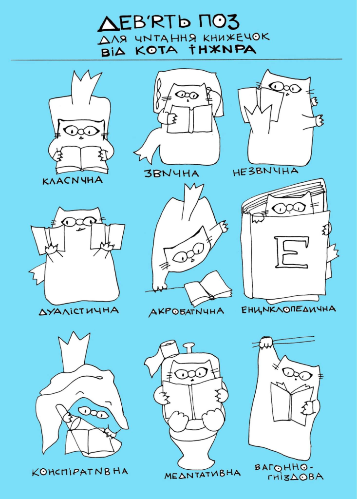 - Девʼять поз для читання книжечок від кота Інжира: https://www.facebook.com/photo/?fbid=682276305248080&set=a.211212719021110
