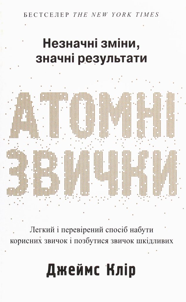 Анотація: Цей практичний посібник допоможе щодня ставати кращими на 1%. Він навчає читачів простому набору правил для створення корисних звичок і відмови від шкідливих, використовуючи «Чотири закони зміни поведінки». Змінитися можуть усі, проблема не в людях, а в системі, за якою вони автоматично живуть. Книга пропонує дієві кроки для зміни своїх налаштувань. Автор цього підходу спирається на біологічні, психологічні й нейрологічні дані. Щоб продемонструвати практичність задуму та надихнути читачів, він використовує історії олімпійських чемпіонів, відомих артистів, бізнесменів, лікарів-рятувальників, які здобули успіх завдяки науці маленьких звичок. Проте цей метод підійде не тільки для досягнення великих цілей — він ефективний для початку здорового способу життя, просування кар’єрними сходами та загального розвитку особистості.
