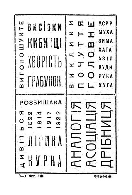 Михайль Семенко не робив каліграм у стилі “малюнок із тексту”, як Аполлінер, але він радикально працював із типографікою, що є іншою формою візуальної поезії. Михайль Семенко не обмежував поезію традиційним рядком. Він створював поезомалярство, де форма розташування слів на сторінці має значення, яке дорівнює значенню слів самих.