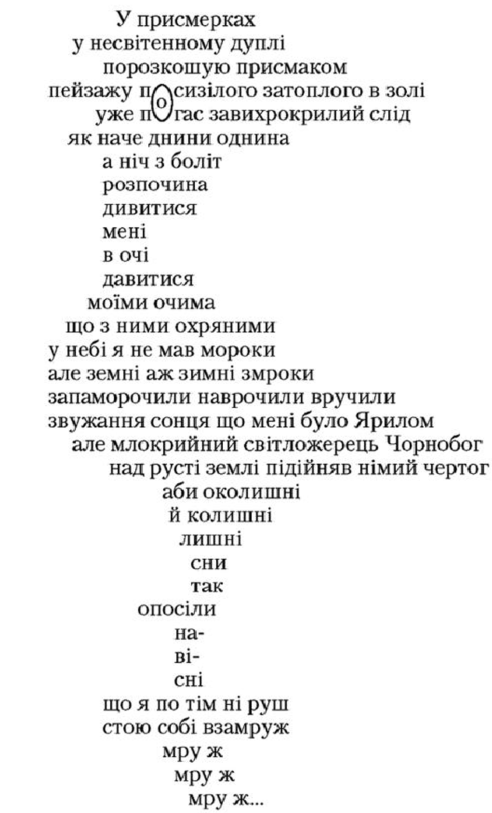 Вірш “Зарізана голубка та водограй” витриманий в елегійних, журливих інтонаціях. Поетова душа “в тремкій напрузі”, коли він пригадує своїх друзів, а довгий перелік їхніх імен (та ще й поданий без розділових знаків) створює враження нескінченного списку людей, які постраждали від війни. Струмені водограю суголосні сльозам ліричного героя, вони плачуть разом: “Душа ятриться з непокою // І водограй рида зі мною”.