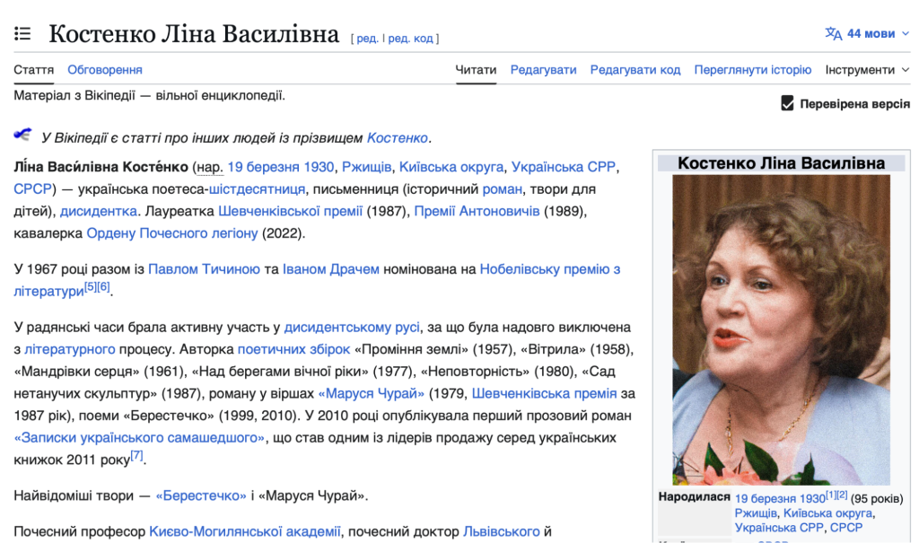 Проаналізуй статтю вікіпедії про Ліну Костенко і зроби висновок про те, які акценти зроблено в цьому тексті. Як би ти писав таку статтю про цю саму постать?