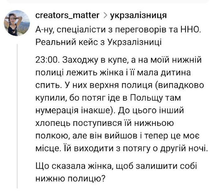 Розіграйте діалог в купе поїзда між пасажирами або пасажирками на одну із запропонованих ситуацій.