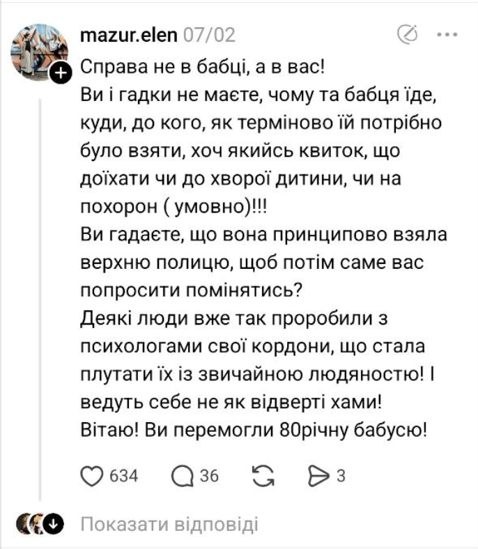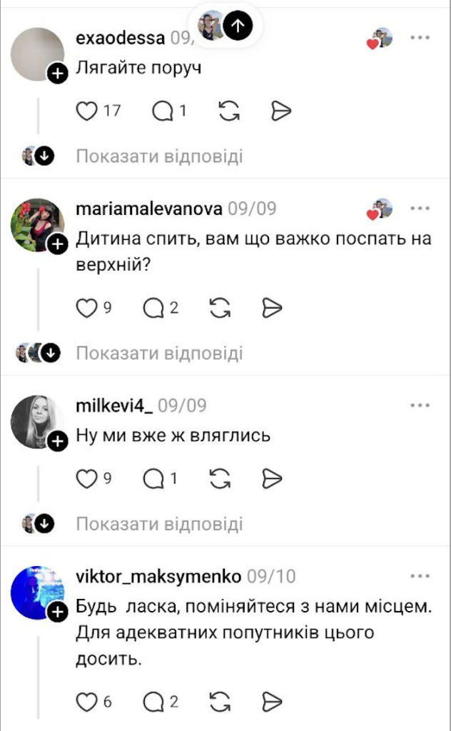 Якщо ви відчуваєте загрозу домагань, насилля або інших протиправних дій з боку пасажирів, негайно сповістіть про це залізничників, щоби ми могли втрутитись і зреагувати! Залізниця має чіткий алгоритм вирішення конфліктів, що можуть виникати в замкненому просторі між різними людьми на шляху прямування поїзда.