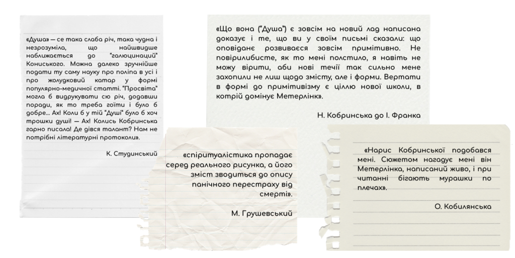 Зверніть увагу учнів на те, що Кирило Студинський вважав твір «медичним протоколом» без «душі» і казав, що Наталія Кобринська втратила свій талант. А Іван Франко, хоч надрукував та визнав емоційну силу тексту, ставив під сумнів художню майстерність авторки.