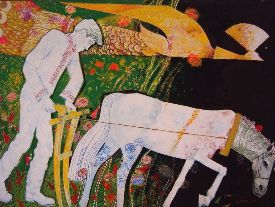 Розглянь картину чоловіка Алли Горської художника Віктора Зарецького «Василь Стус — орач» (1989). Яким бачить художник поета? Які символи ти зауважуєш на цій картині? Про що вони?
