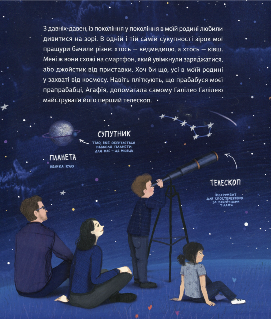 Якщо коротко, без спойлерів, розказати сюжет, то це оповідь про хлопчика з родини астрофізиків. Уночі батьки розповідають йому про Всесвіт. Одного разу після цих історій до головного героя приходить «дівчина з темної матерії». Вони починають дружити й вирушають у пригоди. Як і у всіх добрих історіях, щось стається не так, як хочеться, але герої справляються з труднощами. Між рядків я базово пояснюю про планети Сонячної системи, що таке темна матерія, як розвиваються зірки та як розширюється Всесвіт.