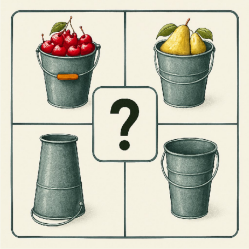 1. Проаналізуй схему з відрами. Що, на твою думку, доречно зобразити чи написати в центральному квадраті? Чи варто наповнювати порожнє відро? Чим?