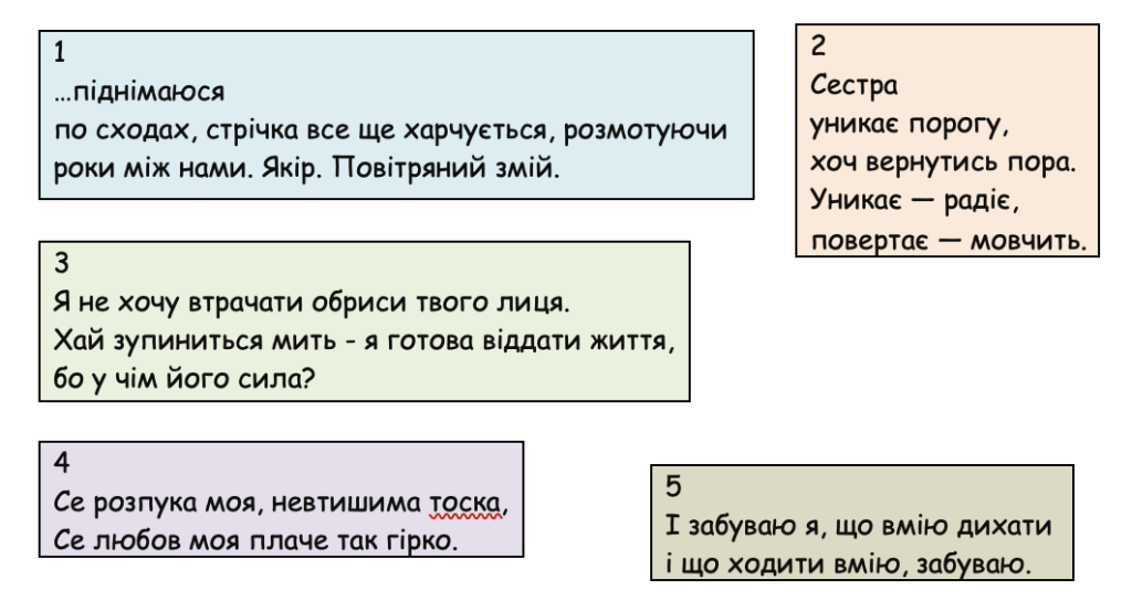- Текстова інтерпретація: про що говорить ліричний герой? Який конфлікт/намір/звернення?