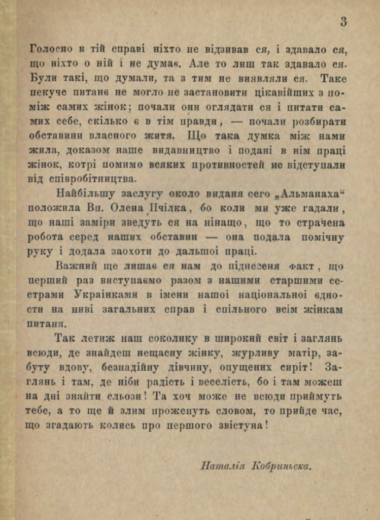 «Видаючи «Жіночий альманах» з самих жіночих праць, ми не гадаємо відчужуватися від мужчин на полі загальних стремлінь і ізолювати жіноче питання від інших суспільних задач. Ми лиш переконані, що ніхто ліпше від нас самих не зможе знати про наші терпіння, недостатки і вимоги, що ми повинні старатися ближче об’яснити наше положення в суспільстві».